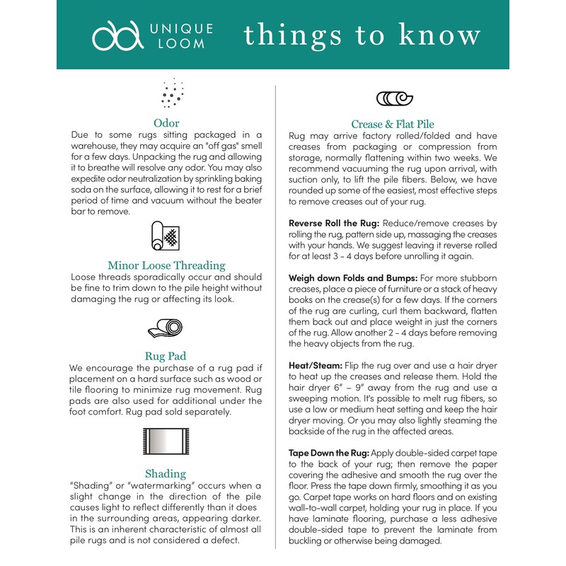 - SHIPPING: Rug will arrive factory rolled/folded and may have creases from packaging & compression from storage, flatting over time.