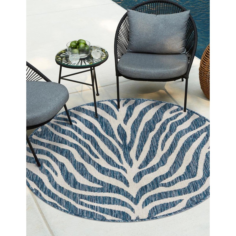 Unique Loom Outdoor Safari Collection Area Rug - Tsavo (4' 1" Round, Blue/ Ivory)