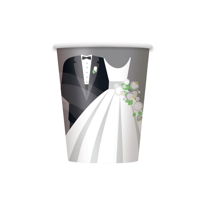 - SOPHISTICATED DESIGN: Add some sophistication to your party table with these cups that feature a bridal gown and a wedding tuxedo