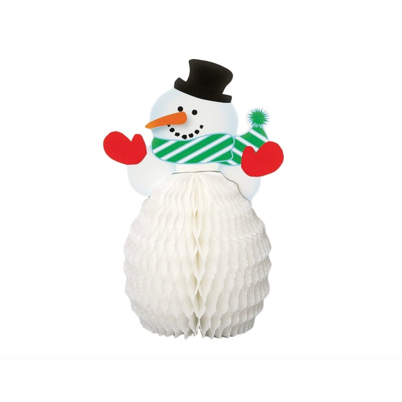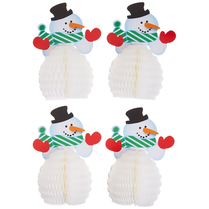 Make a wintertime table setting come to life with these Mini Snowman Holiday Centerpiece Decorations. Designed to look like smiling snowmen and featuring big round honeycomb bases, these table centerpieces will make a magical addition to any Christmas party or holiday party. Display these honeycomb decorations in the center of the kid's table to delight youngsters when it's time for a holiday meal. Or, arrange them around a refreshment table to bring some snowy style to a spread of party snacks and drinks.