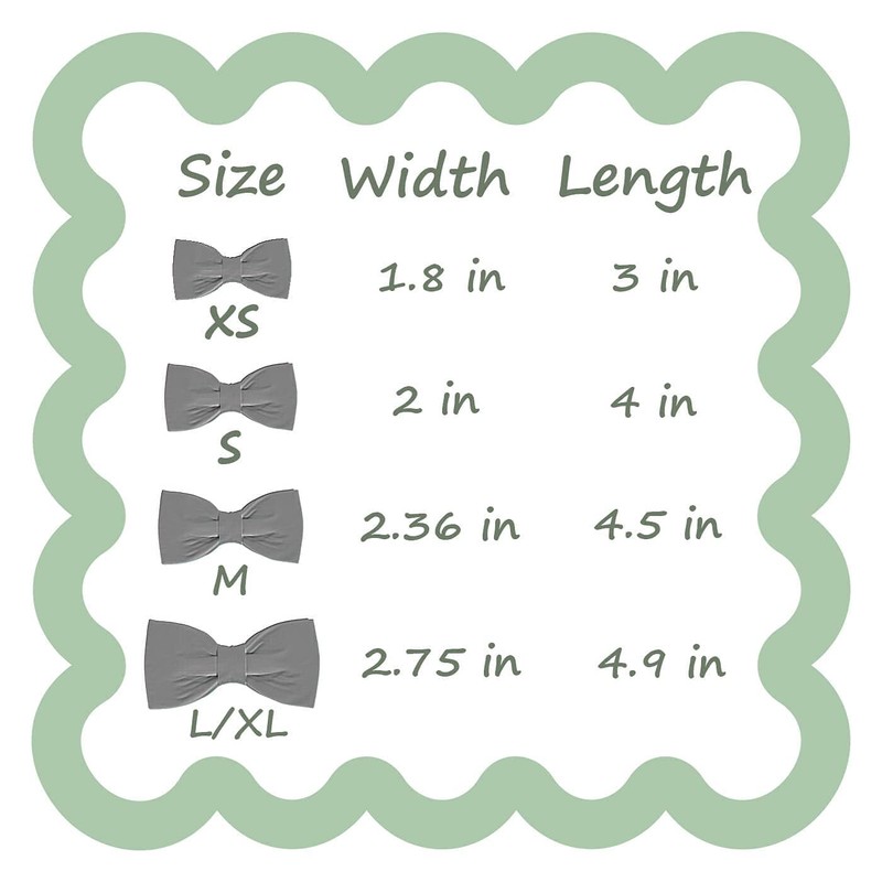 XS Collar=(length:8"-12" , width:5/8"), XS bow=(length:3.25", width:3.9")