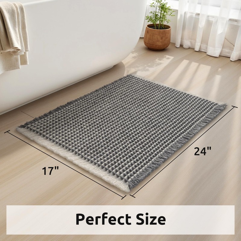 Unique Waffle Bath Mat Non Slip Super Absorbent Bath Mats for Bathroom Floor 3D Two Tone Waffle Quick Dry Bathroom Mat with Tassels Machine Washable Bathroom Rug Beside Tub, 17" x 24"