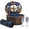 • Accessories - Basket in size 17" x 13" x 9", contains all necessary essentials you need for your picnic: 2 x stainless steel flatware(fork, spoon and knife)with wooden handle, 2 x 7"ceramic plates, 2 x wine glasses, 1 x stainless steel waiter's corkscrew with wooden handle, 1 x stainless steel cheese knife with wooden handle, 1 x oval pine wood cheese board, 2 x navy blue/white check cotton napkins.All the tableware are reusable, food-safe and dish-wash safe.