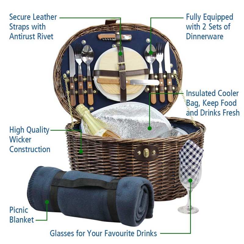HappyPicnic is delighted to offer you our deluxe wicker picnic basket set, including: 2 x stainless steel knives with hard wooden handle 2 x stainless steel forks with hard wooden handle 2 x stainless steel spoons with hard wooden handle 2 x ceramic 7" dinner plates 2 x wine glasses 1 x stainless steel waiter's corkscrew with hard wooden handle 1 x stainless steel cheese knife with wooden handle 1 x oval pine wood cheese board 2 x navy blue/white check cotton napkins EXTRA: 1 x picnic fleece blanket