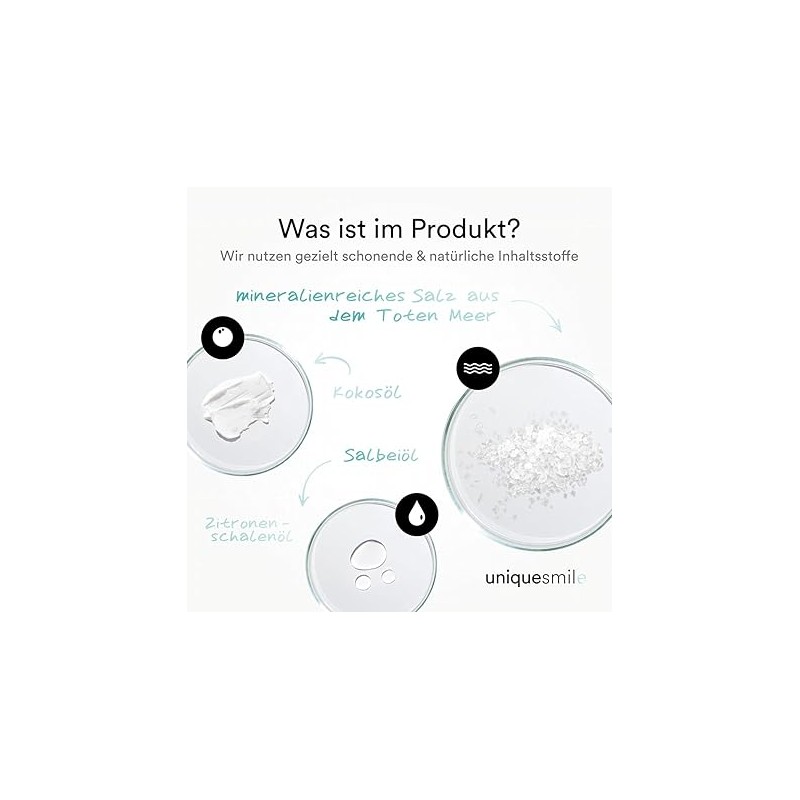 - 100% organic coconut oil, sage oil and salt from the Dead Sea – benefit from our 2-in-1 effect. Pamper your teeth with natural, high-quality ingredients. The result: white and healthy teeth