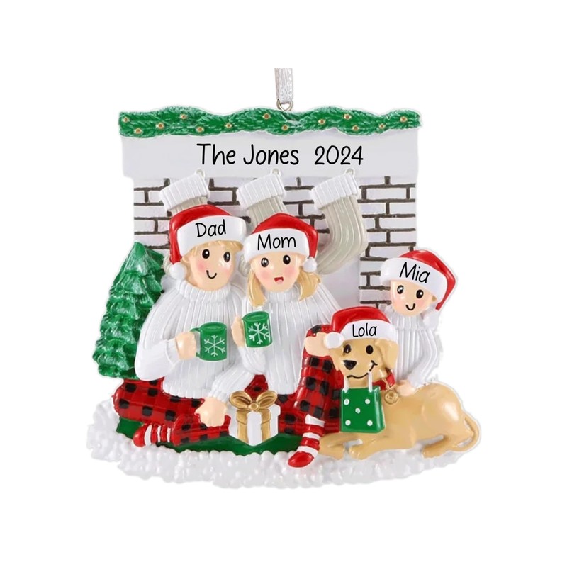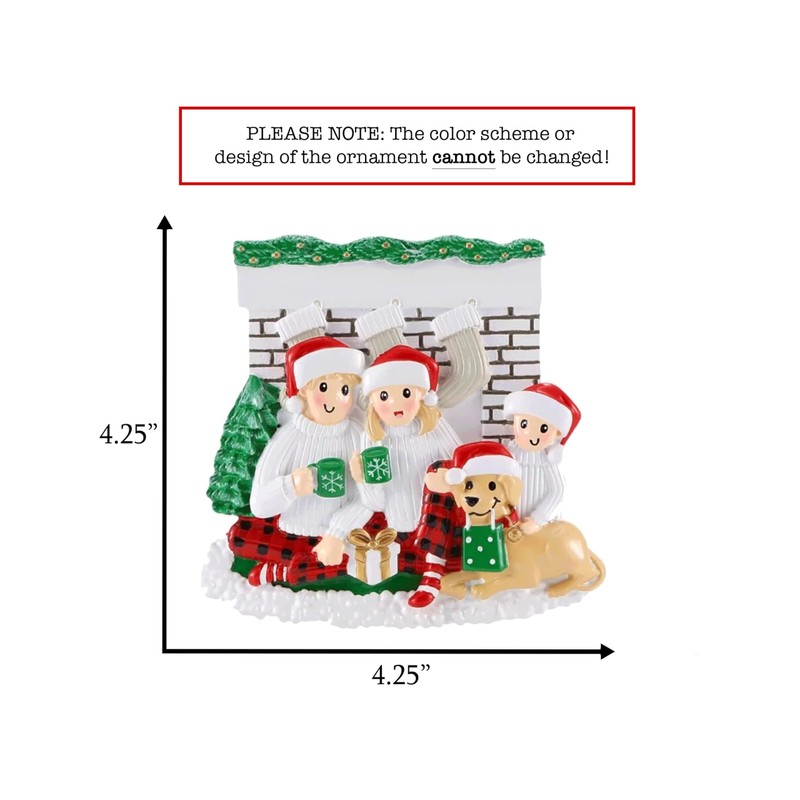 UniqXmas Personalized Fireplace Family of 3 with Dog Christmas Ornament 2024 | Customized First Christmas as Family of Three People with Puppy Ornament for Xmas Tree | Custom Name & Year