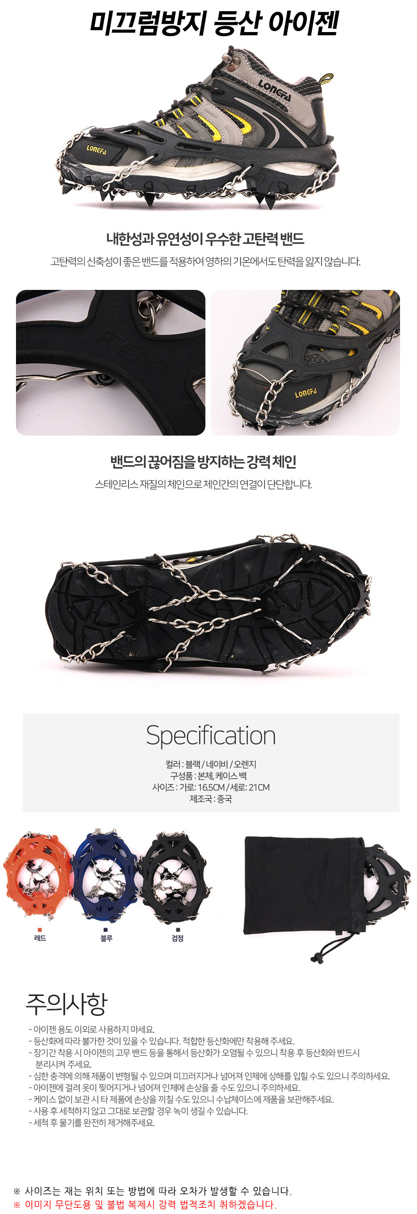 - Precautions: Do not use crampons for purposes other than intended use. Wear only suitable hiking shoes. Be careful of contamination of hiking shoes when worn for a long period of time. Be careful of product deformation and personal injury due to falling in case of severe impact. Be careful of personal injury due to tearing of clothes or falling due to crampons. When stored without a case, be careful of damage to other products. Washing required after use, completely remove moisture.