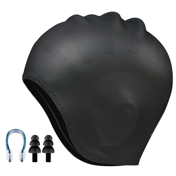 Unisex Silicone Swimming Cap with 3D Ear Protection, Keep Hair Dry, Waterproof Comfortable for All Water Sports, Includes Ear Plugs and Nose Clip