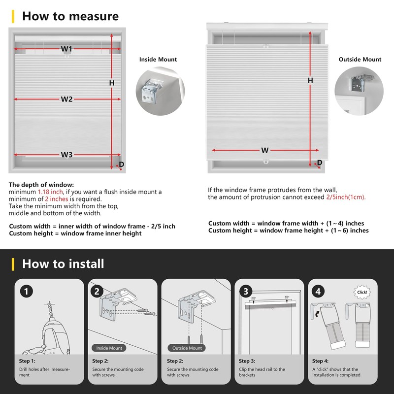 - 1【 HOW TO SELECT SIZE】Installed inside the window please order according to the actual window size (the actual width of the Cellular Shades will be reduced by 3/8 inches to fit the window). Installed outside the window please add 2-6 inches each to the actual window width and height to ensure coverage.