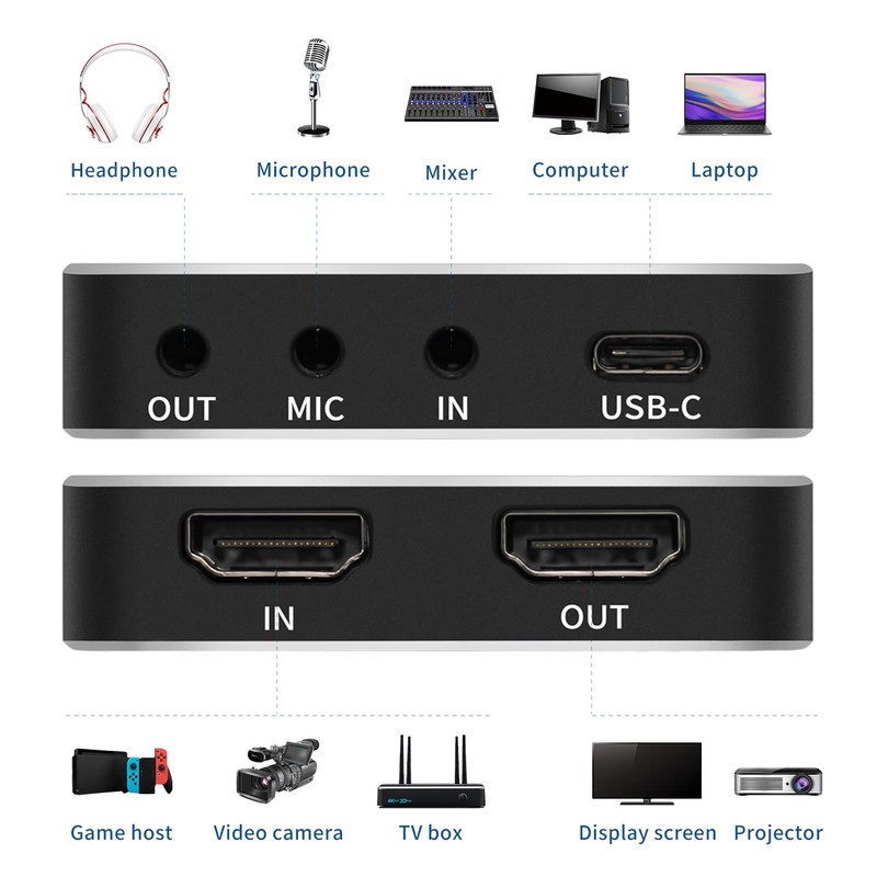 - 【 Mic-in for Commentary】: Game capture card features a built-in 3.5mm Microphone and Audio Input/Output Port, which enables you to plug a 3.5mm headset or microphone so that you can stream your voice and record your voice by the ports easily.You can use it to add external commentary when playing the game.