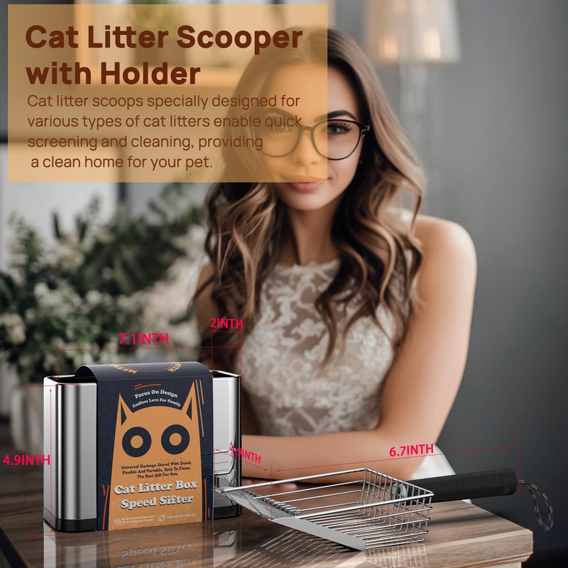 • 5. Thoughtful Set for Hassle-Free Pet Care: This stainless steel litter scoop set includes a large dual-layer metal cat litter scoop and a metal storage stand. It efficiently removes clumps and can be rinsed clean for storage or reuse, saving busy pet owners time and effort