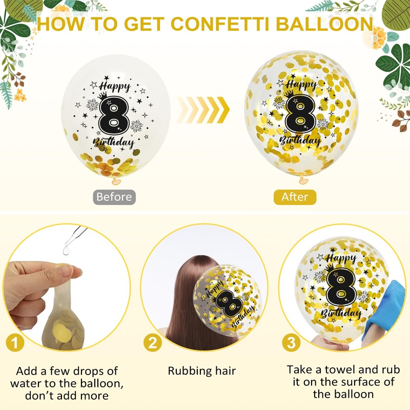 - 15 pieces 8th birthday balloons: you will receive 15 pieces 12 inch happy 8th birthday balloons, including 5 black balloons, 5 metallic gold balloons and 5 gold confetti balloons, which are suitable for young 8th birthday party decoration and add more highlights for your birthday celebrations.