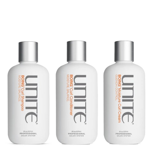 The Unite BOING Curl Trio Bundle is the ultimate hair care solution for curly hair enthusiasts. This bundle includes three essential products designed to cleanse, condition, and define your curls, ensuring they stay bouncy, hydrated, and frizz-free. Each product in the Unite BOING Curl Trio Bundle is formulated with high-quality ingredients that work together to enhance the natural beauty of your curls, making them more manageable and vibrant. What is included in Unite BOING Curl Trio Bundle? • Unite BOING Curl Shampoo 236ml• Unite BOING Curl Conditioner 236ml• Unite BOING Defining Curl Cream 236ml What are the features and benefits of Unite BOING Curl Trio Bundle? Unite BOING Curl Shampoo 236ml: This gentle shampoo is specifically designed to cleanse curly hair without stripping away its natural oils. It helps to maintain the moisture balance in your hair, leaving your curls soft, shiny, and full of life. The shampoo also contains ingredients that help to reduce frizz and enhance curl definition. Unite BOING Curl Conditioner 236ml: This conditioner provides intense hydration and nourishment to your curls, making them more manageable and easier to style. It helps to detangle knots and smooth out the hair cuticle, resulting in frizz-free, defined curls. The conditioner also strengthens the hair, reducing breakage and promoting overall hair health. Unite BOING Defining Curl Cream 236ml: This curl cream is the perfect finishing touch for your curly hair routine. It helps to define and shape your curls, providing long-lasting hold and control without weighing them down. The cream also adds moisture and shine, giving your curls a healthy, vibrant look. It is ideal for all curl types and can be used on both wet and dry hair. Who is Unite BOING Curl Trio Bundle for? This bundle is perfect for anyone with curly hair looking to enhance their natural curls and maintain healthy, frizz-free hair.