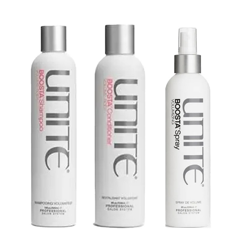 The Unite BOOSTA Trio Bundle is the ultimate hair care set designed to give your hair volume, shine, and manageability. This bundle includes three essential products from the Unite BOOSTA range, each formulated to work together to enhance your hair's natural beauty. The BOOSTA Shampoo gently cleanses while adding volume, the BOOSTA Conditioner nourishes and detangles, and the BOOSTA Volumizing Spray provides an extra lift and long-lasting hold. Perfect for anyone looking to achieve salon-quality results at home, this trio is a must-have for voluminous, healthy hair. What is included in Unite BOOSTA Trio Bundle? • Unite BOOSTA Shampoo 300ml• Unite BOOSTA Conditioner 236ml• Unite Boosta Volumizing Spray 236ml What are the features and benefits of Unite BOOSTA Trio Bundle? Unite BOOSTA Shampoo 300ml: This volumizing shampoo gently cleanses your hair while adding body and fullness. Its lightweight formula ensures that your hair is not weighed down, making it perfect for fine to medium hair types. The shampoo also enhances shine and manageability, leaving your hair looking and feeling revitalized. Unite BOOSTA Conditioner 236ml: The BOOSTA Conditioner is designed to complement the shampoo by providing essential moisture and detangling benefits. It helps to smooth and soften your hair, making it easier to style. The conditioner also adds volume and bounce, ensuring that your hair looks full and healthy. Unite Boosta Volumizing Spray 236ml: This volumizing spray is the final step in the BOOSTA Trio Bundle, offering an instant lift and long-lasting hold. It can be used on damp or dry hair to create volume at the roots and throughout the lengths. The spray also provides thermal protection, making it ideal for use with heat styling tools. Who is Unite BOOSTA Trio Bundle for? The Unite BOOSTA Trio Bundle is perfect for anyone looking to add volume, shine, and manageability to their hair, especially those with fine to medium hair types.