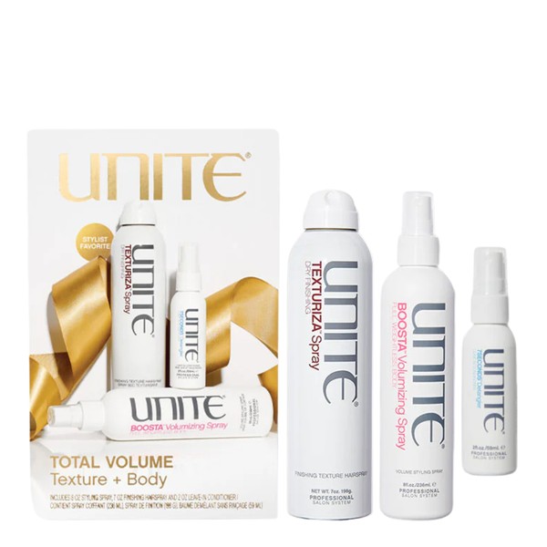 The Unite Total Volume Pack is your go-to solution for achieving voluminous, textured hair effortlessly. This comprehensive pack includes three of Unite's best-selling products designed to enhance volume, texture, and manageability. Whether you're looking to add body to fine hair or maintain a voluminous style, this pack has everything you need. Each product is formulated with high-quality ingredients to ensure your hair looks and feels its best. What is included in Unite Total Volume Pack? • Unite Texturiza Spray 198g • Unite Boosta Volumizing Spray 236ml • Unite 7 Seconds Leave In Detangler 59ml What are the features and benefits of Unite Total Volume Pack? Unite Texturiza Spray: This spray provides instant volume and texture, giving your hair a fuller appearance without weighing it down. It's perfect for creating tousled, beachy waves or adding lift to your roots. Unite Boosta Volumizing Spray: Designed to amplify your hair's volume, this spray adds body and lift to even the finest hair types. It also provides a light hold, ensuring your style stays in place all day. Unite 7 Seconds Leave In Detangler: This leave-in conditioner detangles and conditions your hair in just 7 seconds, making it easier to manage and style. It also provides UV and thermal protection, keeping your hair healthy and vibrant. Who is Unite Total Volume Pack for? This product is perfect for anyone looking to enhance their hair's volume and texture, especially those with fine or flat hair.