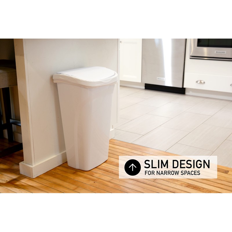 - For Each Room at Home – This white trash can with lid is space efficient and versatile, making it ideal for the bathroom, bedroom, kitchen, and office spaces. The bin's design makes replacing the liner easy. 13 gallon trash bags are recommended.
