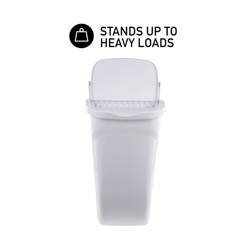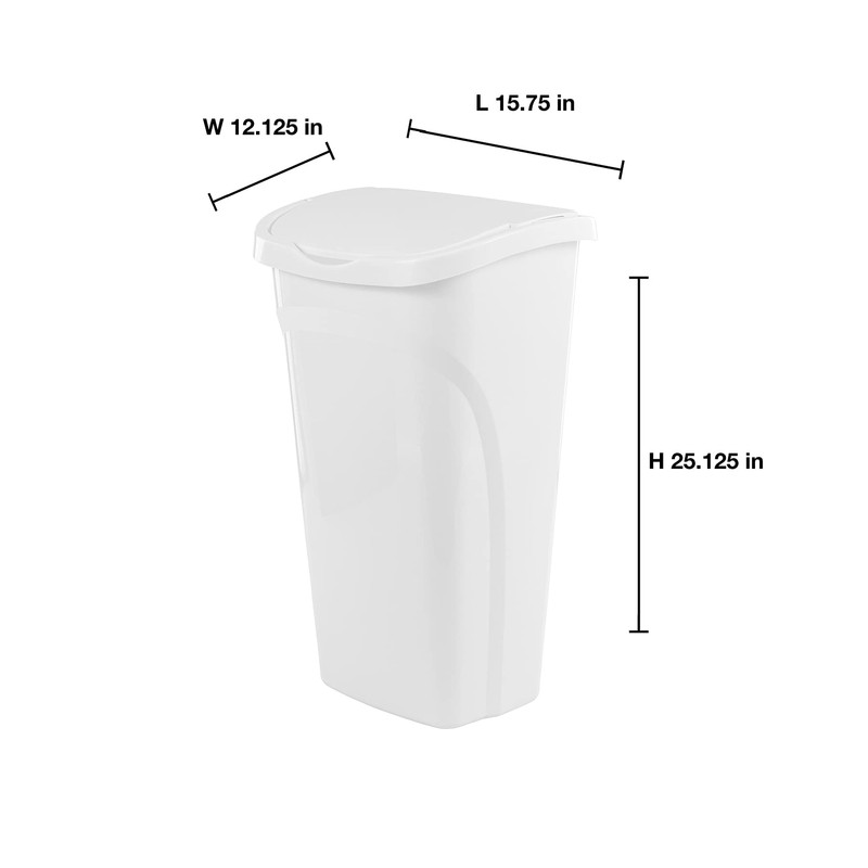 - Swing Top Lid – The center-weighted swing lid keeps the mess out of sight. It opens easily and the removable lift-off lid design makes it simple to empty and clean your trashcan. This slim trash can makes disposing of waste mess-free and efficient.