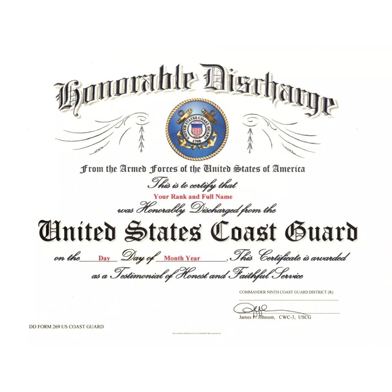 United States Coast Guard Honorable Discharge Replacement Certificate