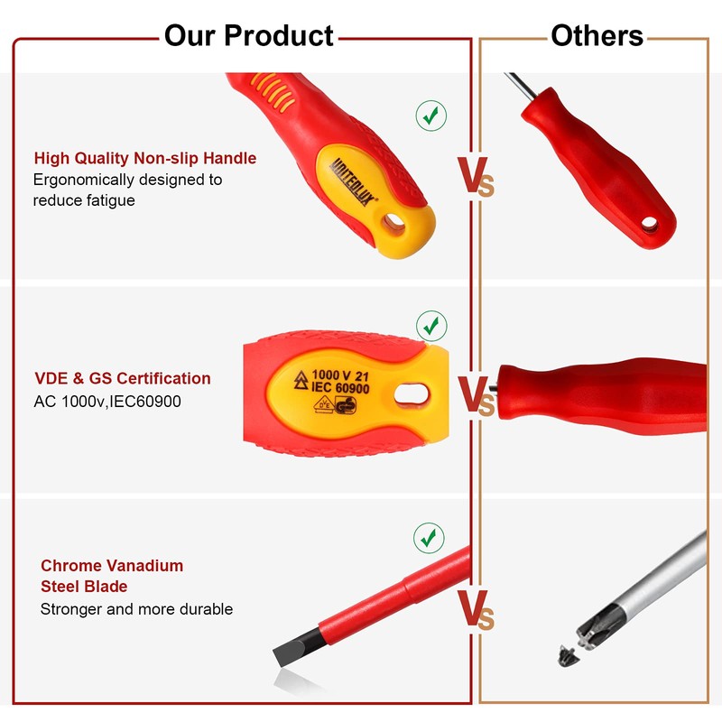 - [SAFE AND RELIABLE]: Each insulated screwdriver tool is individually tested and insulated to 1000 volts AC or 1500 volts DC. VDE and GS certified guarantee safe working standards of 1000 volts. IEC 60900 standards for insulated tools and are clearly marked with the 1000v rating symbol, which can safely withstand 1000v.