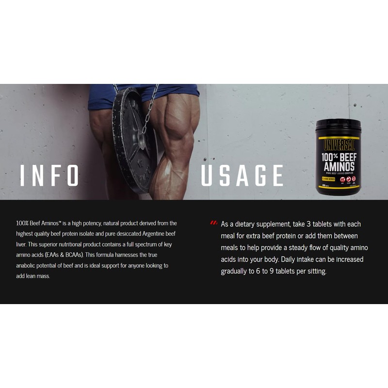 - SUSTAINED-RELEASE: Universal 100% Beef Amino Tablets contain sustained-release beef aminos to ensure that you have a constant amount of beef aminos at all times and to provide a steady flow of quality amino acids into your body with Easy to digest and convenient tablets