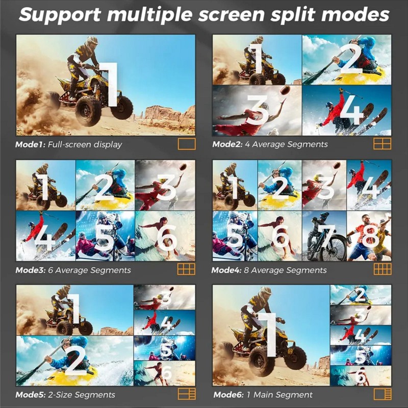 1. 6 Ways Viewing Screen: The 8X1 Quad MultiView Selector support 6 viewing modes. You could see 8 HDMI input sources screen on one monitor by 6 ways, also can only see only one HDMI input source by full screen