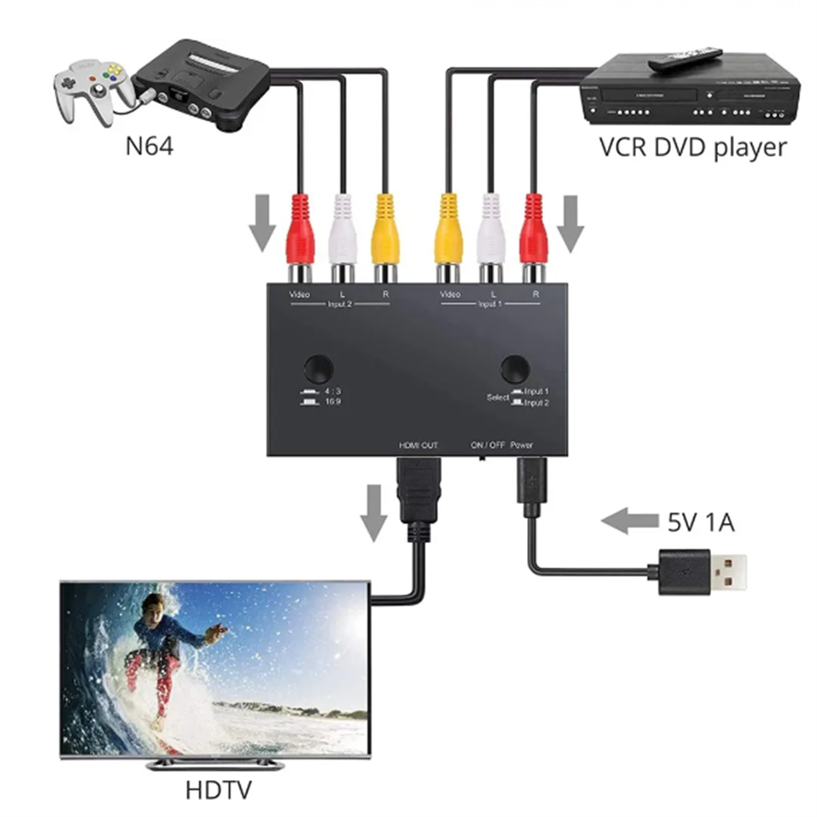 1. 2 Port to HDMI Converter: Connect to Two RCA Sources (such as DVD and for N64) at the Same Time to Avoid Frequent Plugging and Unplugging, Facilitatingthe Use of Multiple Devices