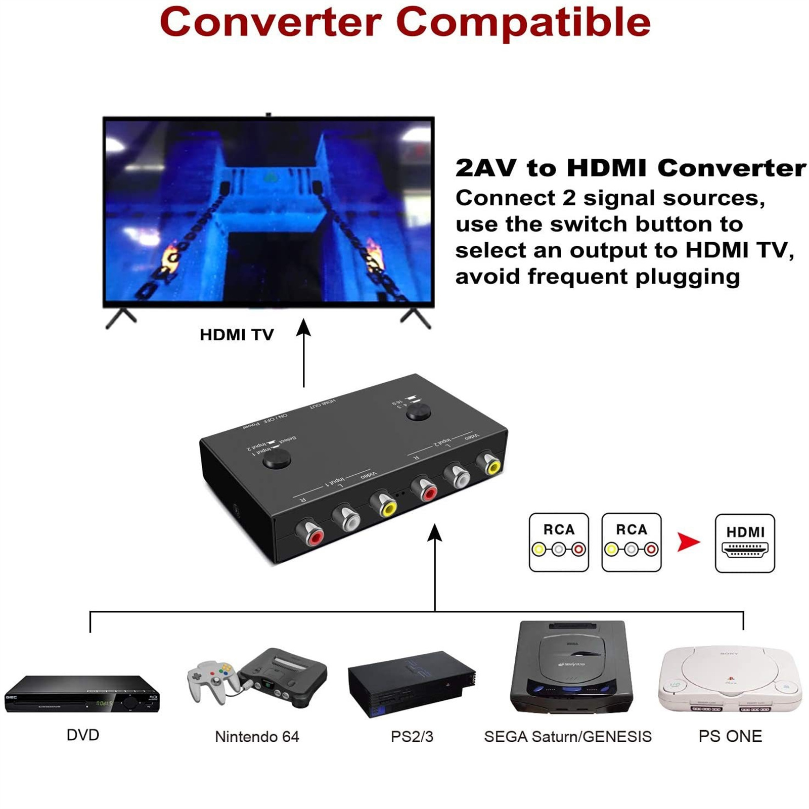 5. 2AV Switcher/2AV To HDMI Converter: Provide Advanced Signal Processing with Greatprecision, Colors, Resolutions, and Details. 2 Port AV to HDMI Converter