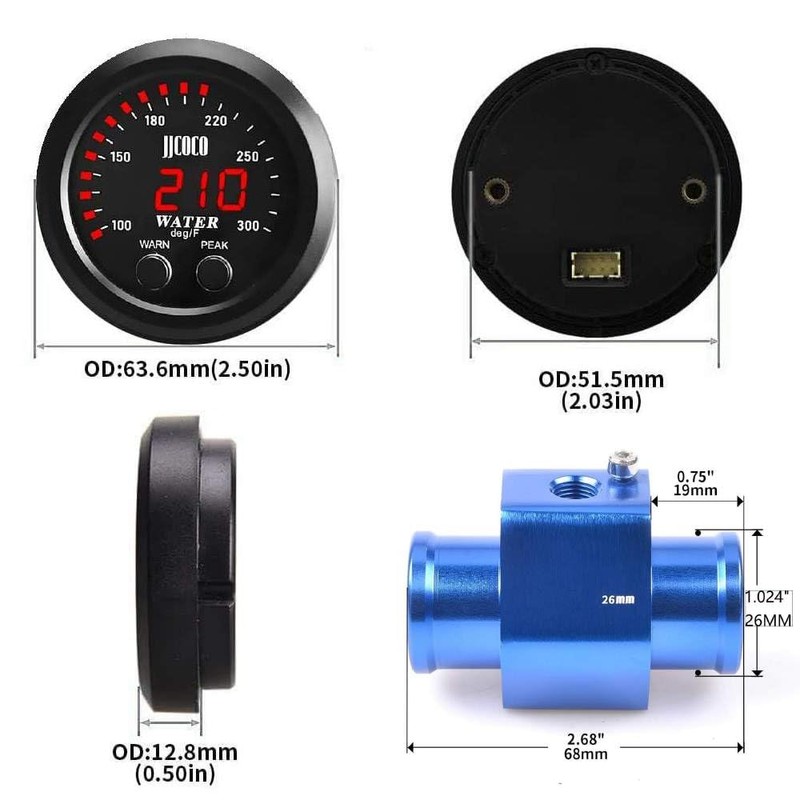 Universal 52mm Water Temperature Gauge 100-300F(38-150C) Electronic Red Digital LED DC12V/24V for Car Automotive with Alarm and Joint Pipe Radiator Sensor Adaptor Blue 26MM