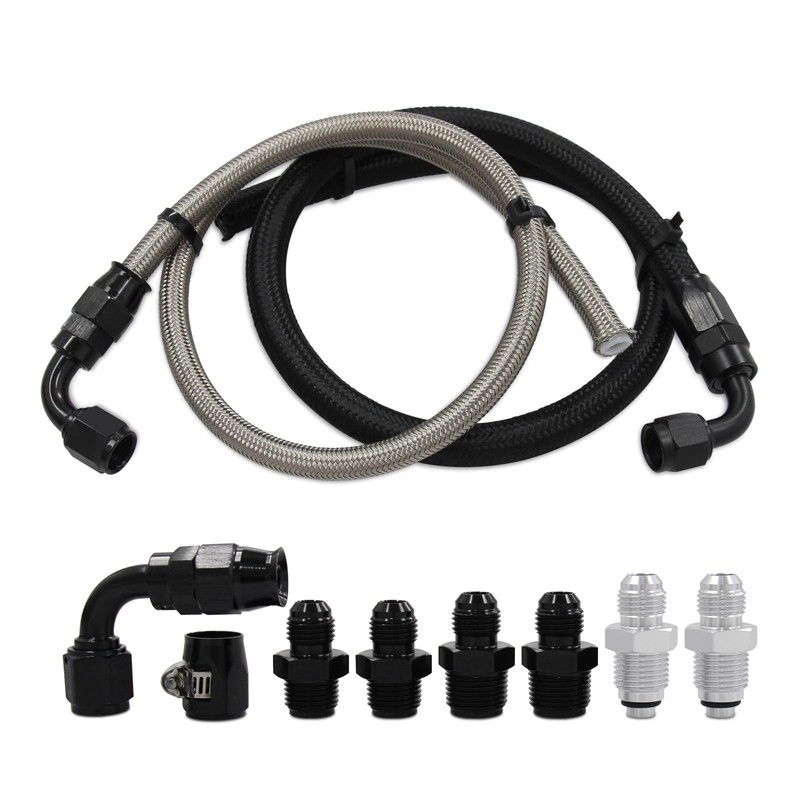 - There are 2 different types of hose used in our kits, Silver Stainless Braided Teflon hose for the pressure line, And Black Stainless Braided rubber hose for the return line