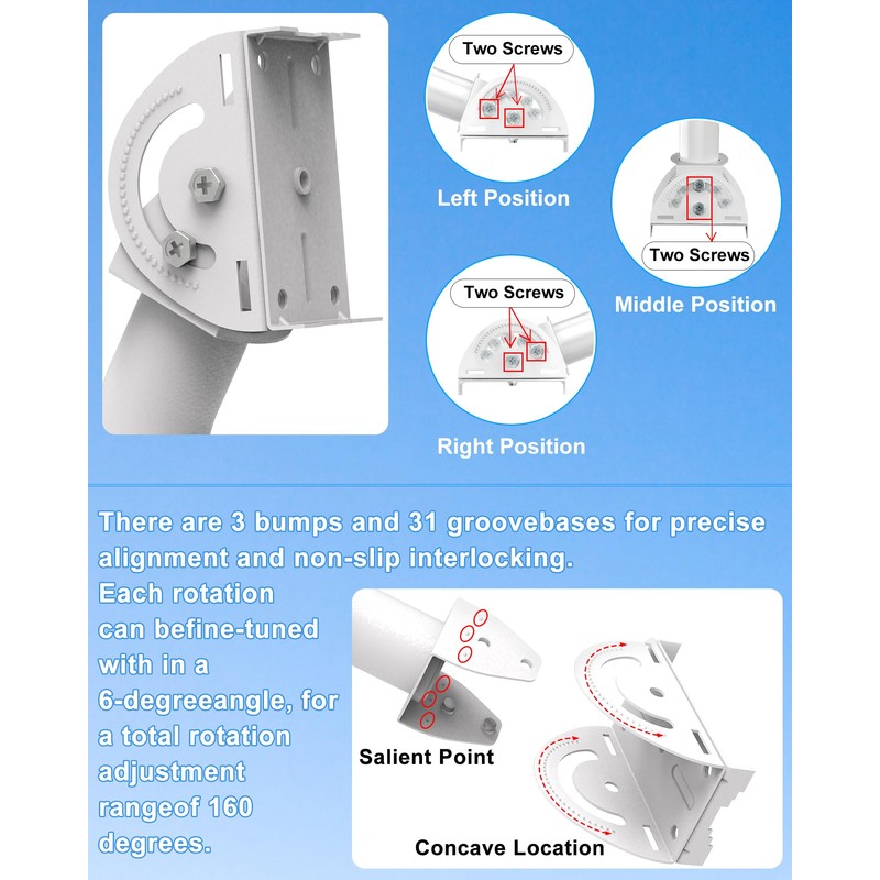 - Stability: Equipped with non-slip gears, the point-to-point wireless bridge pole mount ensures secure installation. Once the angle of the rod is adjusted, a light twist will firmly lock it in place. Additionally, two hoops securely fasten the mount to the rod, providing added stability and peace of mind.