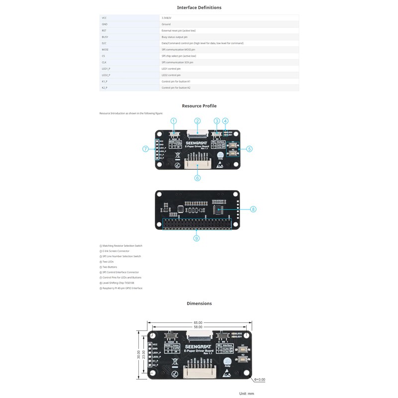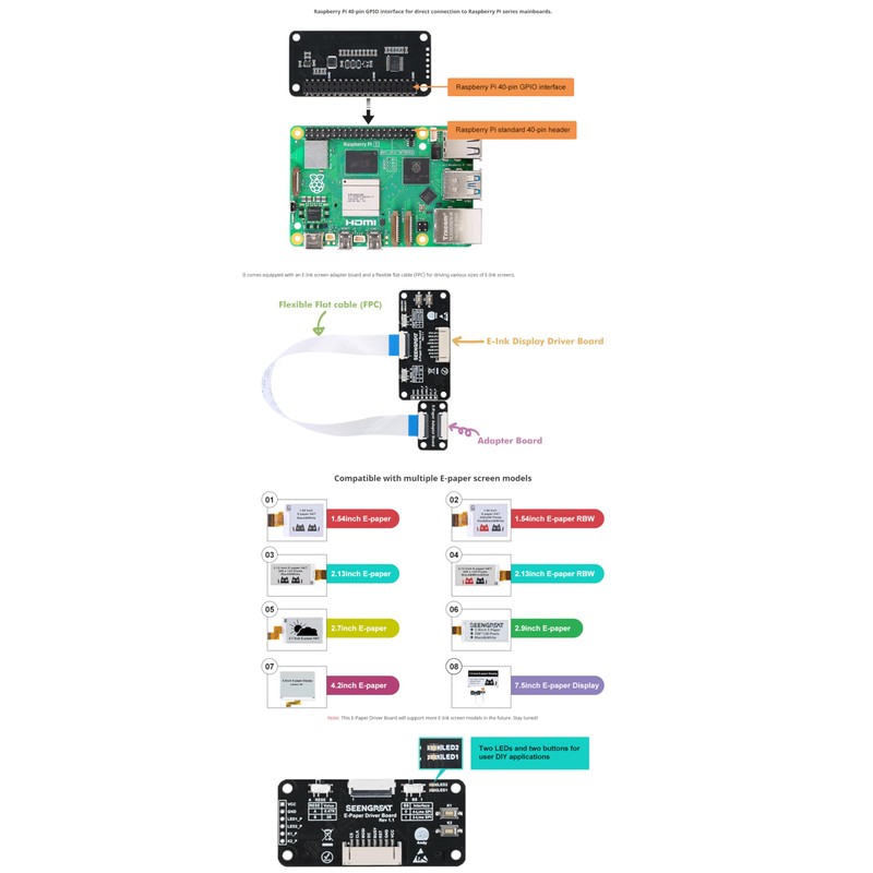 - Efficient SPI Interface: Features an SPI interface with minimal pin requirements, making this E-Paper driver HAT ideal for projects that demand fewer I/O resources without sacrificing performance.