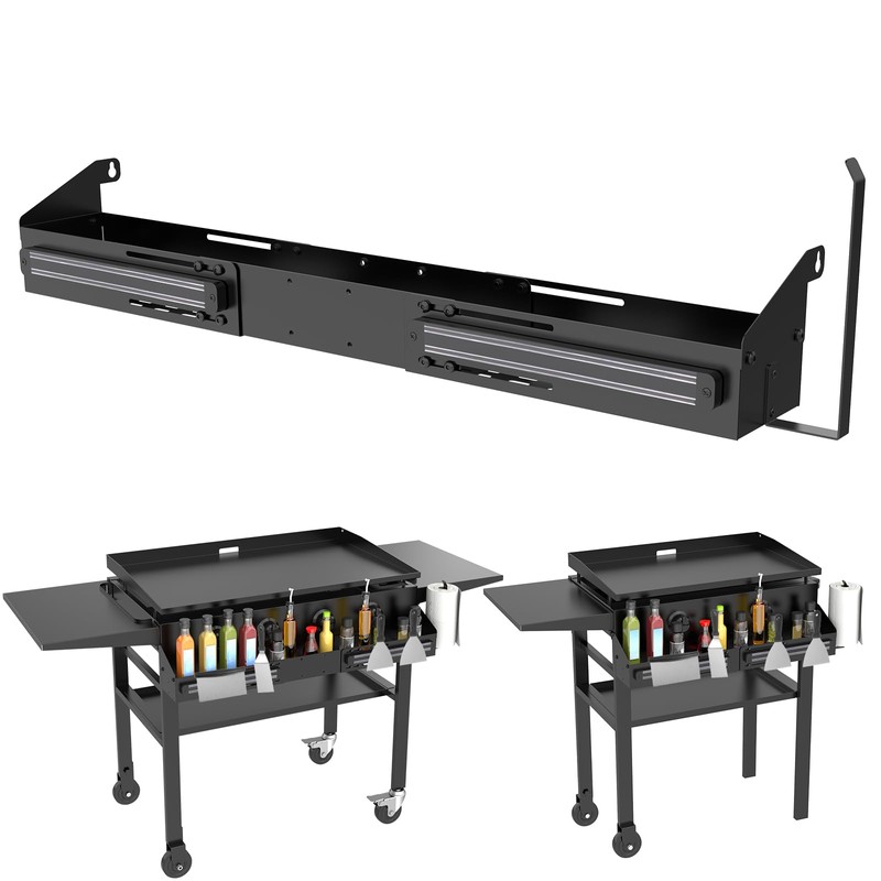 - 【Adjustable Length for Universal Fit】 The griddle accessories feature an adjustable design, allowing you to expand the length from 27.8" to 37.8". The side mounting plates can also be adjusted forward or backward, ensuring the griddle caddy for Blackstone griddle stays level and securely mounted on various models.