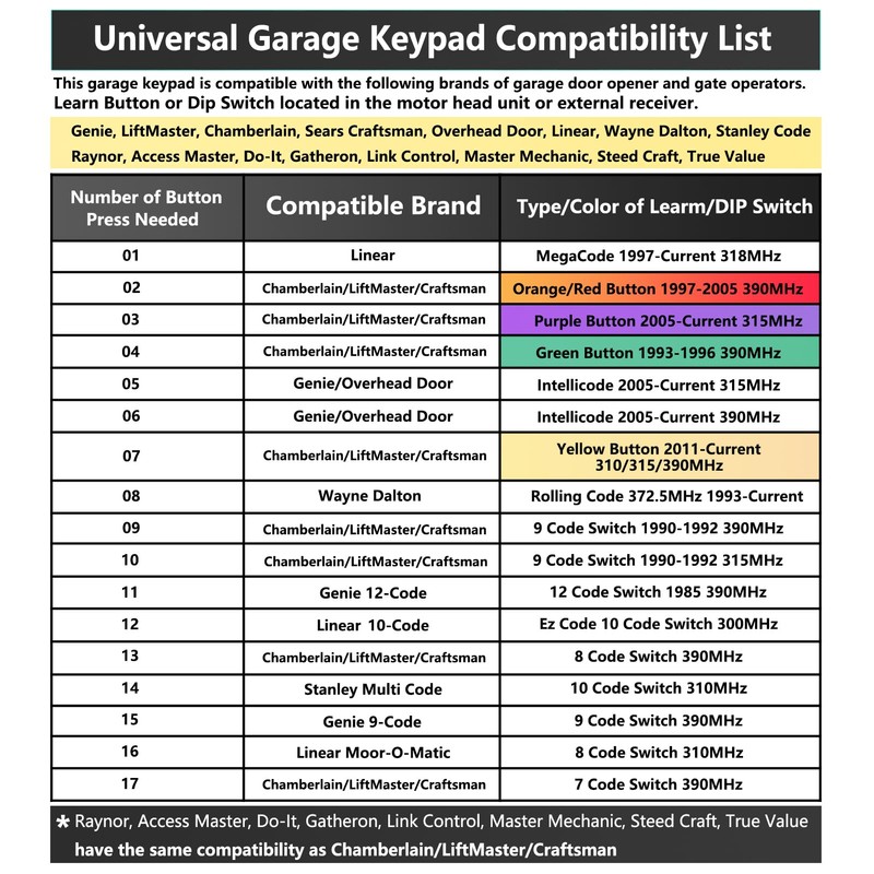 - [Universal Garage Door Keypad]-The universal garage door opener keypad compatible with Genie, Liftmaste, Chamerlain, Craftsman, Linear, Overhead Door, Wayne Dalton, Raynor, Stanley, Access Master, Do-It, Gatheron, Link Control, Master Mechanic, Steel Craft, True Value Opener made from 1983 - Current has Purple/Yellow/Red/Orange/Green/Black color Learn Button or Dip Switch. Support older remote like multicode dip switch remote.