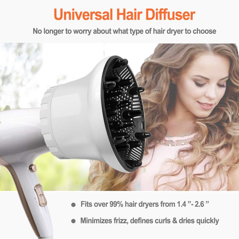 - 【Universal Hair Diffuser】 This hair dryer diffuser is a universal diffuser that fits most hair dryers from 1.4 inch to 2.6 inch. It is an adjustable hair diffuser attachment that matches over 99% of the different hair dryer designs on the market. It opens pretty wide so it can fit a variety of sizes. You no longer have to worry about what type of hair dryer to buy.