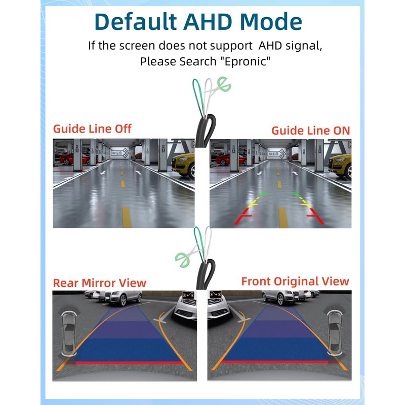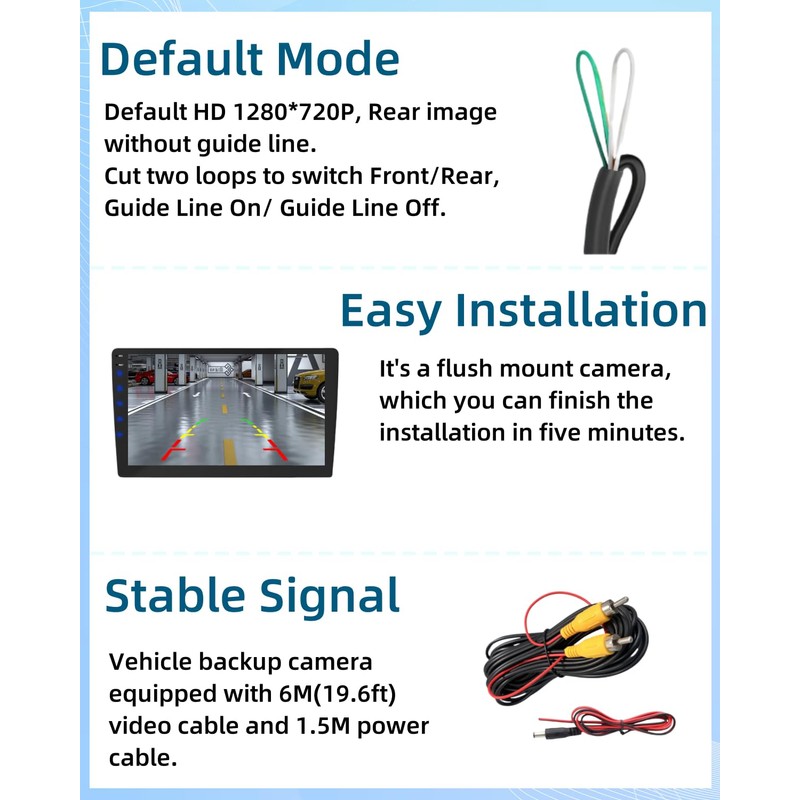 - The default setting of this vehicle rear view camera is HD (1280 x 720P) rear view with guide line. Support front/rear camera and guideline on/off Attetion: After installing the rear view camera, or cut a loop, please start your monitor or radio. Otherwise the correct image will not be displayed.