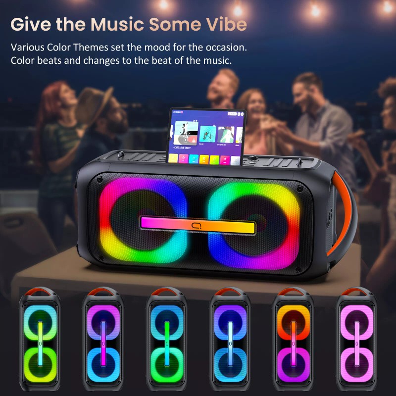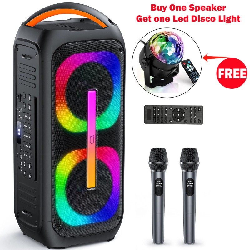 The newest and upgraded Bluetooth karaoke machine of JYX , which has improved the appearance, sound quality and RGB light show. This karaoke sound system built in 120W driver and DSP 5.0 technology delivers chest-thumping bass, well-balanced mid, and crystal-clear highs, MIC reverb controlling for best performance. The colorful RGB light beat with the music rhythm, it's a game-changer for parties. This party speaker equip with 8 funny sound effects, USB/TF card and AUX input, it's the best karaoke machine for parties. This singing karaoke machine support connecting at least 2 karaoke microphones at the same time, perfect for gatherings with your family and friends. In addition, it equipped with TWS function, enjoy a true wireless 360° stereo sound when you get two karaoke speakers. This rechargeable portable speaker is excellent for family entertainment and outdoor party.
