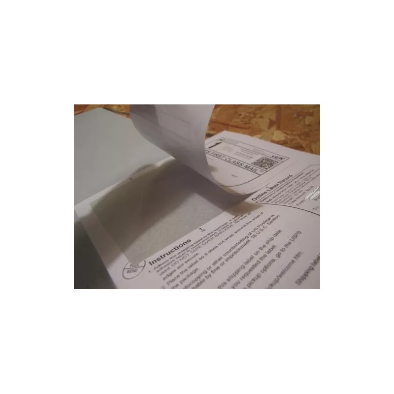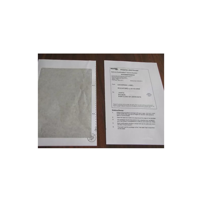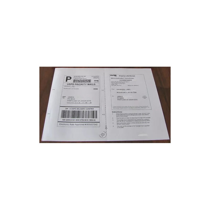 Paper: White 24# Bond - The top portion of the label is a heavy duty sticker that is guaranteed to stick to any box, plastic bag, envelope, tube that you plan to ship.