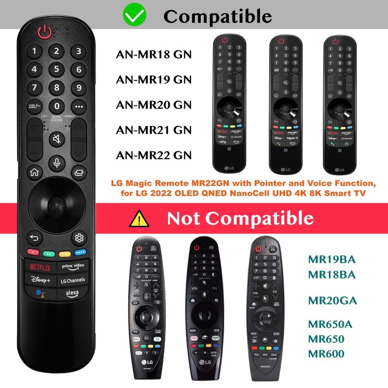 - 【Wide Compatibility】 This magic remote is compatible with LG Smart TVs from 2018 to 2024, including OLED (A1-A4, B1-B4, C1-C4, G1-G4, Z2), QNED (QNED80-QNED99), NanoCell (NANO75-NANO99), and UHD 4K/8K models (UR8000, UQ8000, UP8000 series). Replacement for MR24GA, MR23GA, MR22GA, MR21GA, and MR20GA remotes.