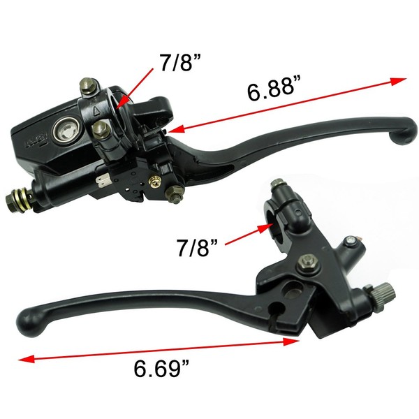 Application: 7/8" handlebar, with lever and brake light switch Left+Right Side Brake Lever Piston Bore size 14mm Bolt Thread 10x1.25mm Package include: Package included: 1X Left Clutch Lever 1X Right Brake Master Cylinder