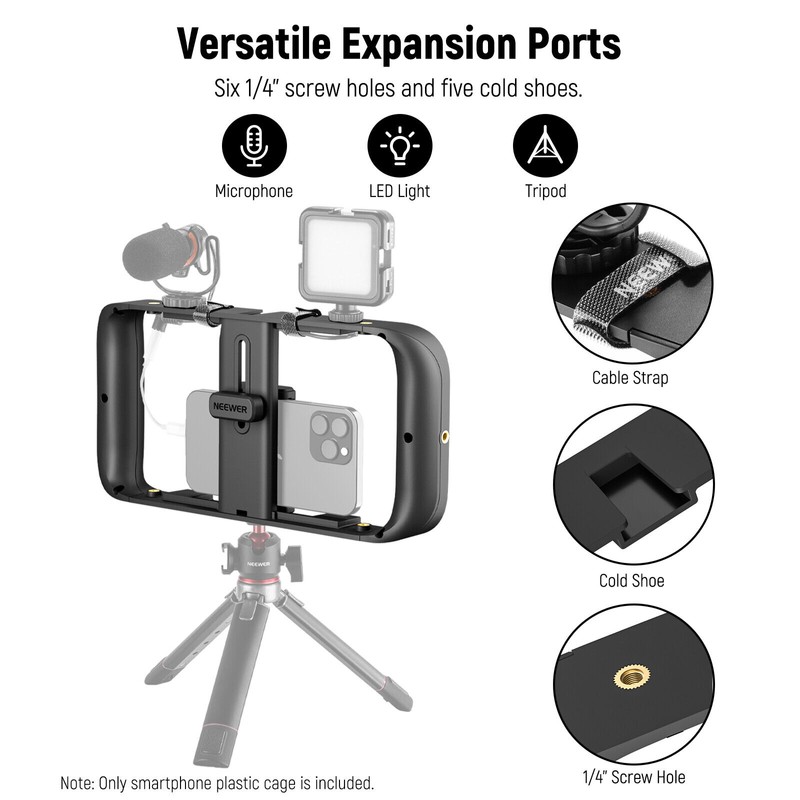 Integrated phone holder is compatible with smartphones 2.2”–3.9” (55–100mm) wide, compatible with iPhone 13 Pro Max 13 Mini XR X XS Max Galaxy S22 Ultra Pixel 6 Pro Android , and other smartphones on the market. Hybrid plastic (ABS+PC) provides a comfortable and firm grasp for taking stable footage. It’s also lightweight and durable for outdoor filming. Cold shoe mounts connect an LED video light and a mini shotgun mic for enhanced video quality. 1/4” threaded holes mount the rig on a tripod or handgrip in vertical and horizontal orientations. Two cable straps secure the device cable and prevent it from blocking the phone camera. Specifications Model: A104 Material: ABS, PC Phone Holder Adjustment Range: 2.2”–3.9” / 55–100mm Dimensions: 11.4” x 5.4” x 1.3” / 290 x 138 x 34mm Weight: 7.8oz / 220g Package Contents 1 x Phone Video Rig 2 x Cable Strap 1 x User Manual 【Universal Smartphone Rig】 Designed with an adjustable phone holder, this video rig is compatible with iPhone 14 Plus 14 Pro Max 13 Pro Max 13 Mini XR X XS Max Samsung Galaxy S22 Ultra Pixel 6 Pro Huawei Honor Magic 4 pro Mate Nova P50 Pro P50 Pocket Android and other smartphones 2.2”/55mm – 3.9”/100mm in width. Ideal for use as a phone stabilizer for video recording【Multiple Mounting Points】 Five cold shoe mounts and six 1/4" threaded holes connect various accessories to the rig, such as a compact LED video light, an RGB light, a mini microphone, and a top handle. Helps make up a complete vlogging and photo video shooting equipment to take your work to the next level【Lightweight & Easy to Use】 Made of robust yet lightweight hybrid plastic (ABS+PC), the rig is easy to hold and provides a comfortable grip for filming on the go. Two cable straps prevent the cable from hanging loose or blocking your camera 【Operate in Two Directions】 As well as handheld operation, you can mount the rig on a desktop tripod, handgrip, or light stand in vertical (portrait) and horizontal (landscape) orientations【For Numerous Applications】 From aspiring content creators to filmmaking hobbyists, this video rig suits a variety of people and applications, including vlogging, live streaming, filmmaking, online teaching, video conferencing, and photography