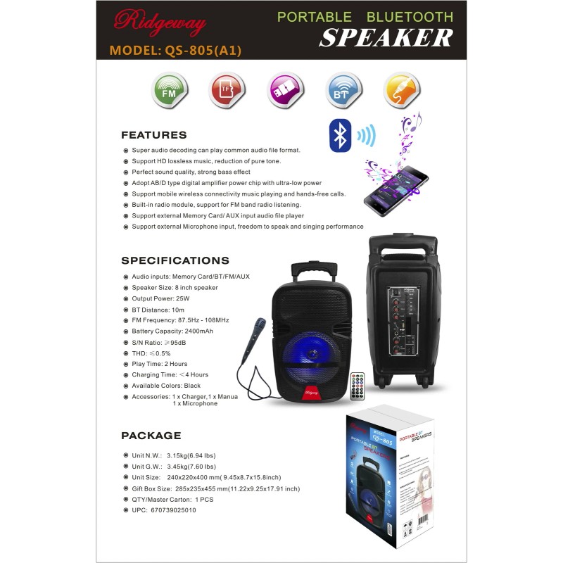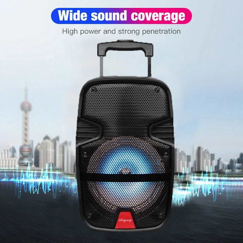 - Audio inputs: Memory Card/BT/FM/AUX๏ Speaker Size: 8 inch speaker