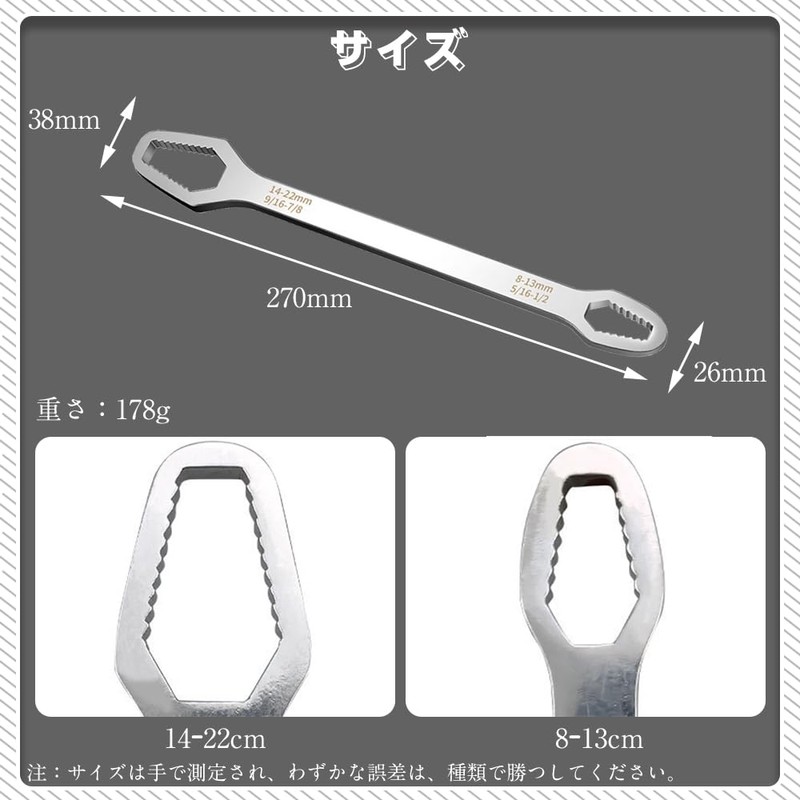 - Specifications: Set of 1 Universal Wrench Material: Steel Color: Silver Size: long 10.6 inches (270 mm), small head width 1.0 inches (26 mm), large head width 1.5 inches (38 mm), weight: 6.0 oz (178 g). Note: The size is measured by hand, slight error can be winned