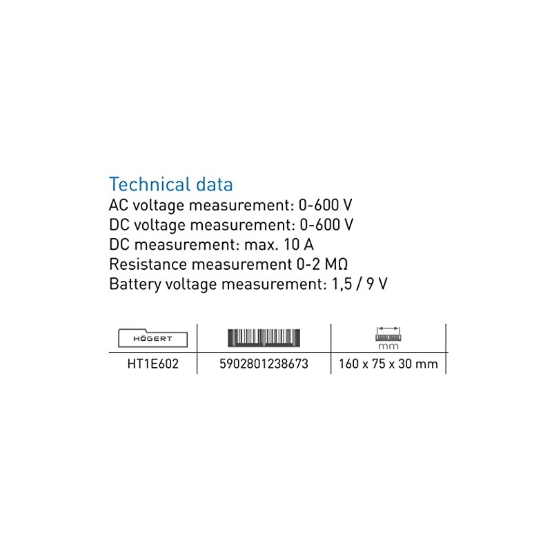 - With the multimeter, you can measure DC voltage up to 600 V and AC voltage up to 600 V, DC current up to 10 A and resistance up to 2 MΩ, perform diode and continuity tests as well as 1.5 / 9 V battery tests