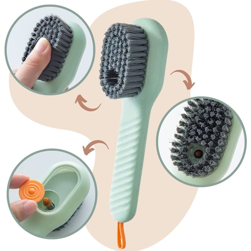 - 👟Multiples Usos: El cepillo de este dispensador de jabón se puede utilizar para limpiar zapatos, ropa, esquinas muertas del baño y otros objetos o esquinas sucias.