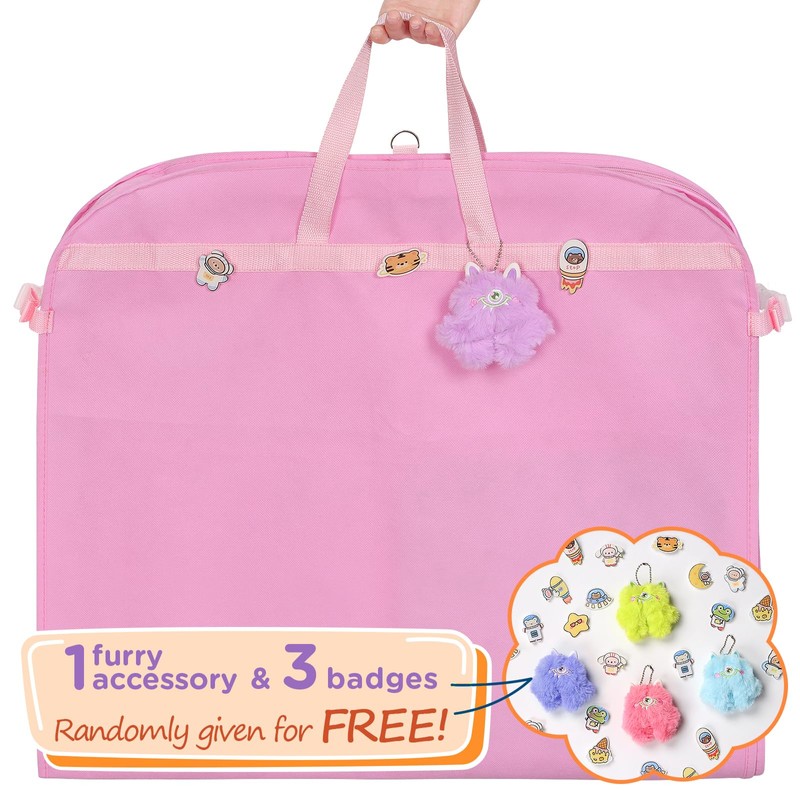 - LOVELY GARMENT BAG - This 50 inch hainging garment bag for kids comes with a plush doll and 3 badges, decorate your distinctive bag with these little accessories.
