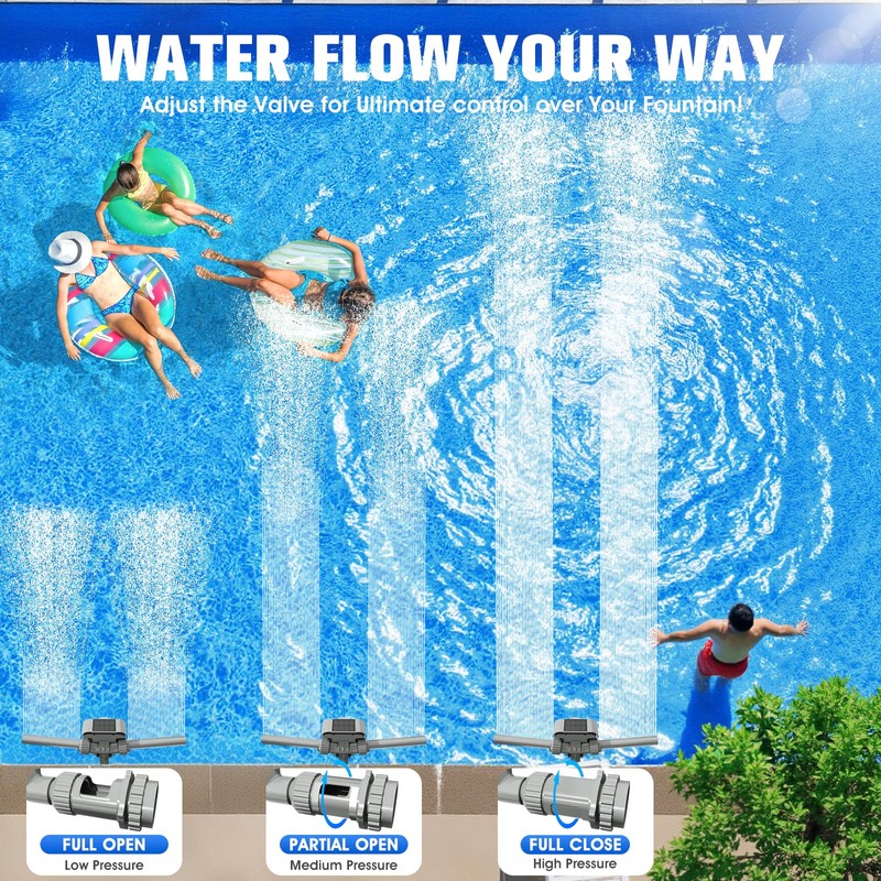 - 【Super Easy to Install】UniWater pool waterfall fountain fits most 1.5'' and 2.2'' male threaded fittings. Simply turn off your pool pump, remove return eye fitting, then install pool fountain on return jet, and adjust the water flow and direction. With the included installation manual, 5 mins setting up this pool jet fountain is a breeze. Let us know if you need help of assemble and installation, UniWater team is always here to help. Come and adds a lot of fun and ambiance to your family pool