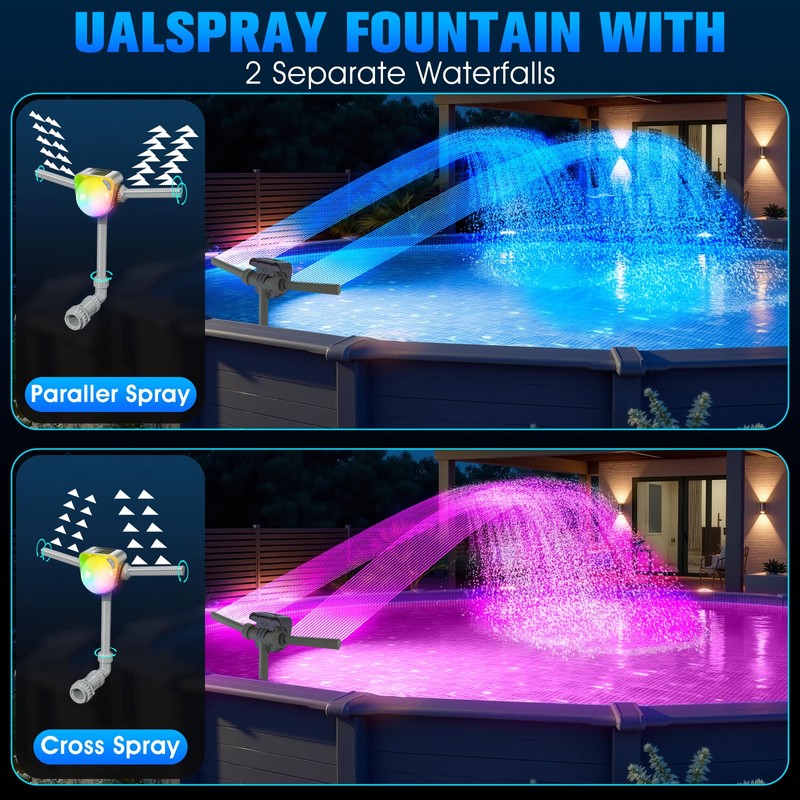 - 【Truly Groundbreaking Innovation】2025 newest patented pool fountain with lights has achieved lower energy consumption and leading the class. The detachable solar pool lights offer unparalleled convenience, auto charge in full sunlight and illuminate the night. The brighter the solar panel is exposed to sunlight, the more vibrant and captivating the light becomes. You can rest assured to choose UniWater pool fountain. Each part is designed in our own factory, which is why we are so confident