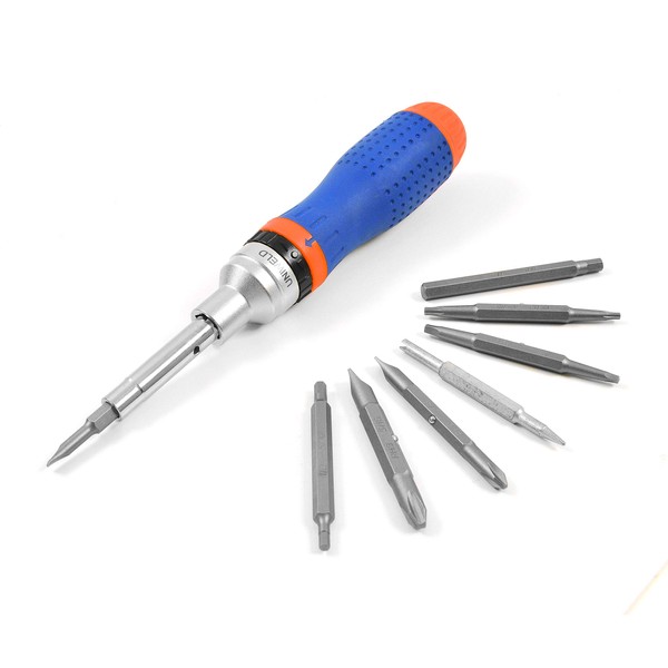 - 14 interchangeable magnetic double-end bits, 3 nut drivers, 2 valve core extractors