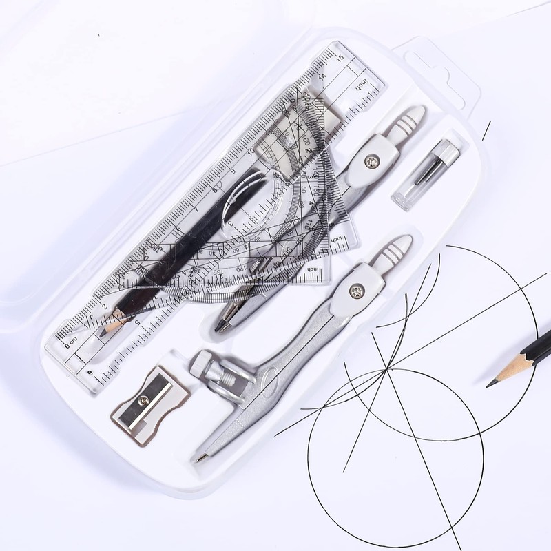 - 10 Piece Geometry Kit Set includes: 2 Metal Study Compasses, 2 Triangles (45° & 30°/60°), 6" Ruler, 4" Protractor, Pencil for Compass, Pencil Sharpener, Eraser, Pencil Lead Refill