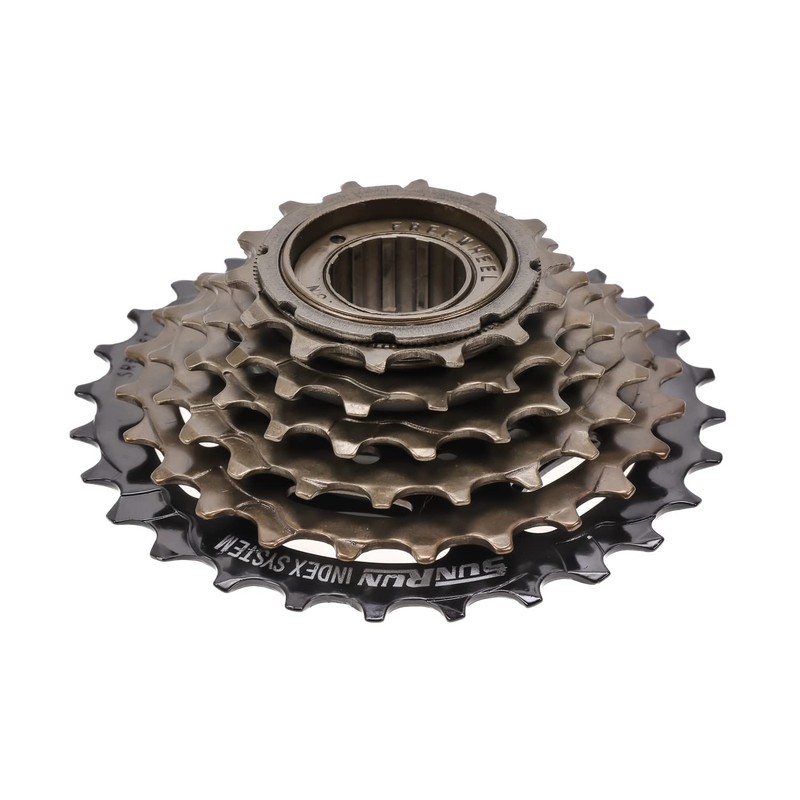 • Short description: bicycle sprocket 6-speed sprocket 14-28 teeth freewheel freewheel for 6-speed sprocket gradation: 6 sprockets 14-28 teeth gradation: (14-16-18-20-24-28) climbing aid = fluid drive plus. Material: steel high-quality sprocket. Wreath is screwed onto the hub), hollow drilled. Brand: SUNRUN